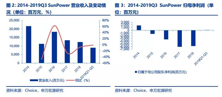 2018 年,SunPower 实现营业收入 123 亿元人民币(“元”指代人民币,以 1 元人民币兑 0.1429 美元汇率换算),同比降低 7.79%;实现归母净利润-57.94 亿元。2018 年受美国 201、301 法案影响,公司部分产品及进口电池片征收额外关税,毛利润仍旧承压,归母净利润好转主要受益于住宅租赁资产处置及减值损失同比减少。2019 年前三季度,SunPower 共实现营业收入 90.03 亿元,同比减少0.69%;实现归母净利润 1.19 亿元。得益于果断的战略转型,以及持续的成本优化措施,SunPower 业绩扭亏为盈。