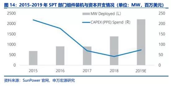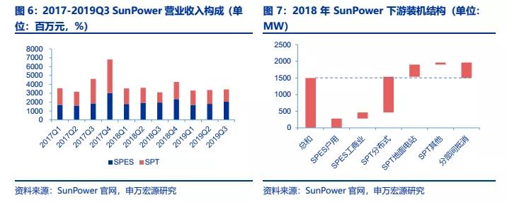 从业务分部数据看,SPT 与 SPES 两大部门的营收占比基本平分秋色,且两者之间存在高额分部抵消项。从终端项目属性看,分布式项目为 SunPower 核心业务焦点,2018 年仅 SPT 分布式业务即贡献装机超过 1GW,而当年SunPower 总装机约为 1.5GW。