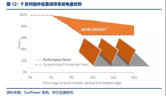 SunPower 在 2015 年收购了 Cogenra,取得该公司研发的独特的电池互连技术,并于同年推出了 P 系列太阳能组件。与传统组件相比 SunPower 的叠瓦组件在效率、性能和可靠性方面都更胜一筹,并具有:1.坚固的叠瓦电池串和先进的封装材料,对热应力、湿度和光衰(PID)具有很强的抵抗力;2.独特的并联电路,减少热斑,增加阴影遮挡与积灰情况下的发电量;3.减少留白,消除焊带,以最大限度地提高效率,降低系统成本和增加电池适配性。SunPower P 系列组件连续两年被全球独立能源认证机构 DNV GL 评为“全球最佳表现制造商“,是为数不多的通过全部热循环、湿热、湿冻、动态机械载荷和 PID 衰减所有 5 项测试的组件。