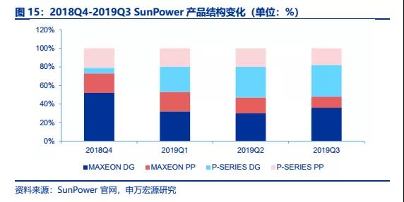 得益于近年来叠瓦产能的快速扩张,SunPower产品结构中 P 系列占比持续提升,2018 年第四季度至 2019 年第三季度,P 系列产品占比已由 27%提高至 52%。在充沛的订单量驱动下,目前 SunPower 叠瓦产能均已处于满产状态,P 系列产品已经成为全球安装量最大的叠瓦组件品类。从市场结构来看,分布式市场(DG)占比已逾 7 成,且其增速亦高于集中式市场(PP)。