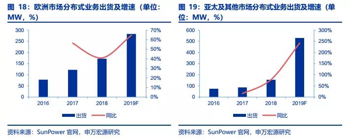 得益于高效产品的优异性能表现和全球化经销网络布局,SunPower 在欧洲及亚太地区的分布式市场取得良好成绩。2015-2019 年,欧洲市场分布式业务营收复合增速约 36%,亚太市场分布式业务营收复合增速约 51%。SunPower 在欧洲市场拥有 450 家以上的经销商网络,在澳大利亚拥有 200 家以上的经销商网络,在东南亚、非洲、拉美等地亦开展了大规模分销渠道建设。