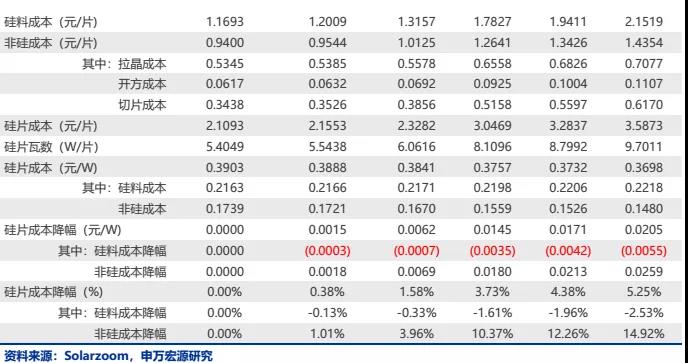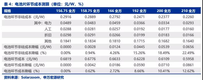 电池、组件环节生产设备一般具有固定通量,大尺寸硅片应用在一定程度上扩大了以功率计量的设备产能,从而摊薄单瓦投资/折旧成本。此外,化学试剂等耗材的单瓦用量,亦随硅片面积增大而减小。以 156.75 全方片为基准,M9、M10、M12 规格硅片分别将电池片环节的非硅成本降低了 15.26%、18.49%、22.49%。若综合考虑原材料硅片的成本降低(一体化测算),则 M9、M10、M12 规格硅片分别将电池片环节的总成本降低了 8.66%、10.41%、12.62%。