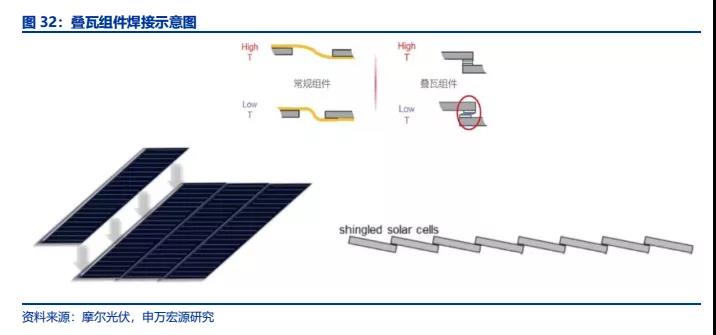 1)传统组件一般都会保留约 2~3 毫米的电池片间距, 而叠瓦工艺通过交叠电池小片,实现无电池片间距,在同样面积下可以放置更多的电池片(60 型常规组件可封装 66-68 片),增加电池片有效发电面积;2)用导电胶替代焊带,减少焊带遮挡面积;3)导电胶直接衔接两片电池,电子运动距离缩短,电阻降低驱动功率提升。此外,叠瓦组件通过柔性连接,应力有效地消弭于每小片电池之间,电池隐裂较常规组件大幅度降低,还能够容纳厚度减低 20-40%的超薄硅片。