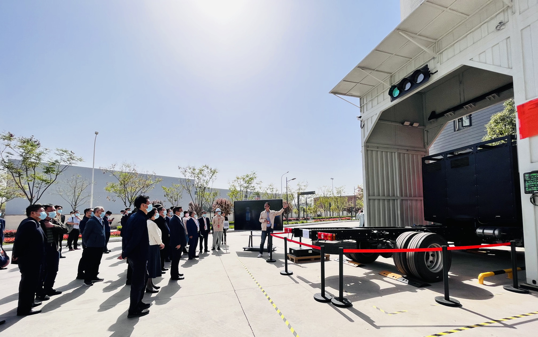 随后调研团一行实地考察了领充新能源重卡换电测试站,工作人员现场演示了重卡全自动换电过程,并详细介绍了领充在“重卡换电”领域的规划布局情况。