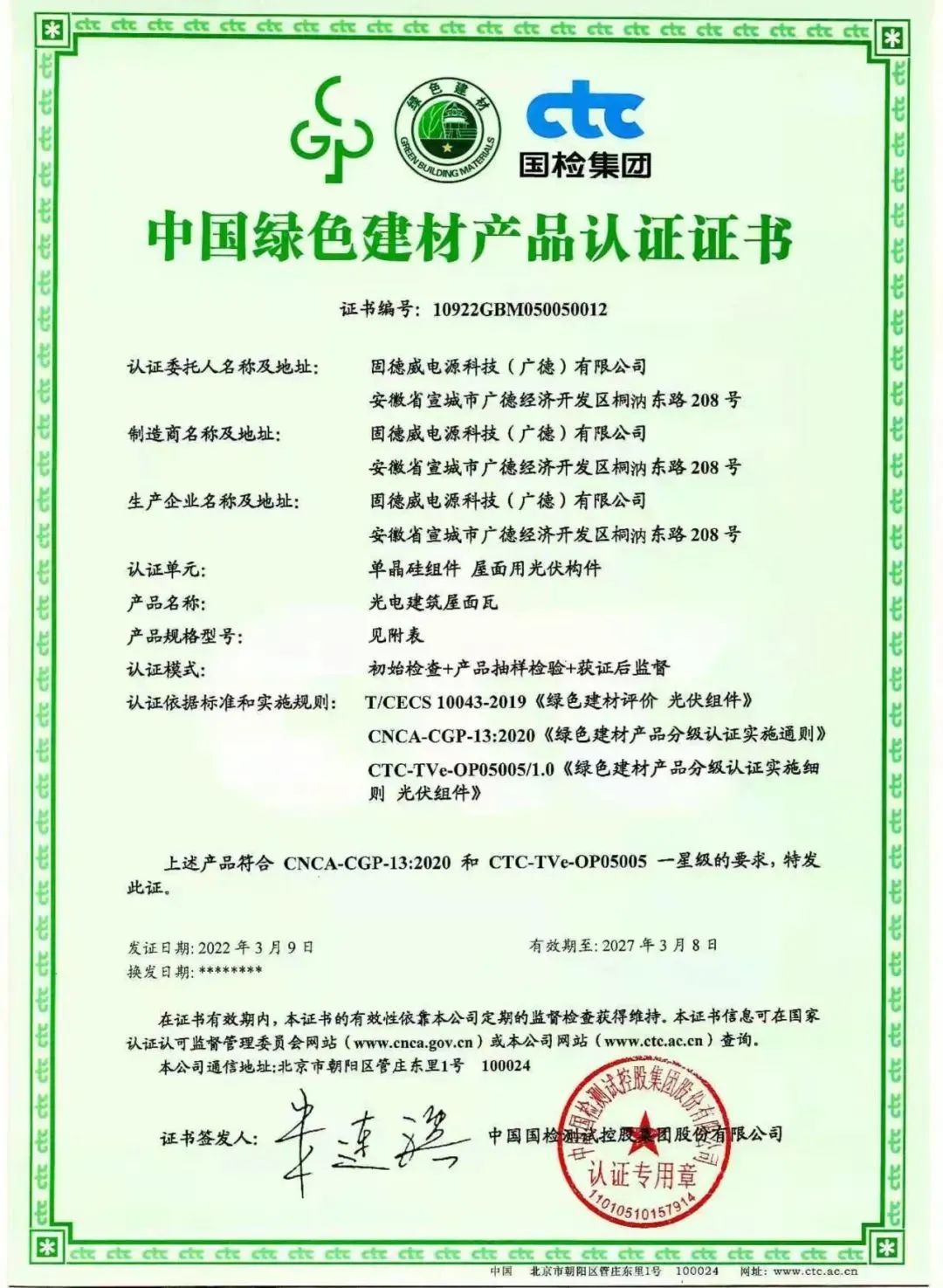 今年3月,固德威光电建材产品荣获CTC国检集团颁发的“绿色建材”产品认证,这是光电建材领域2022年首张绿色建材产品认证证书,打响了今年绿色认证的第一枪。