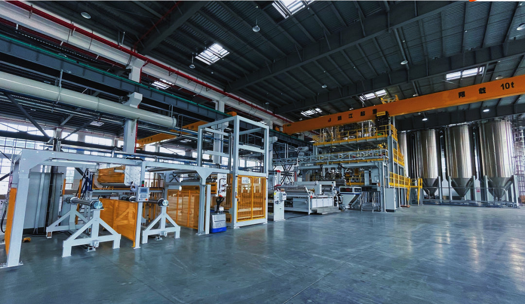 生产线实现了从产品供料、 在线配混到分包码垛等全流程自动化,是全球树脂类高分子防水卷材生产装备和工艺的最高等级技术结晶。