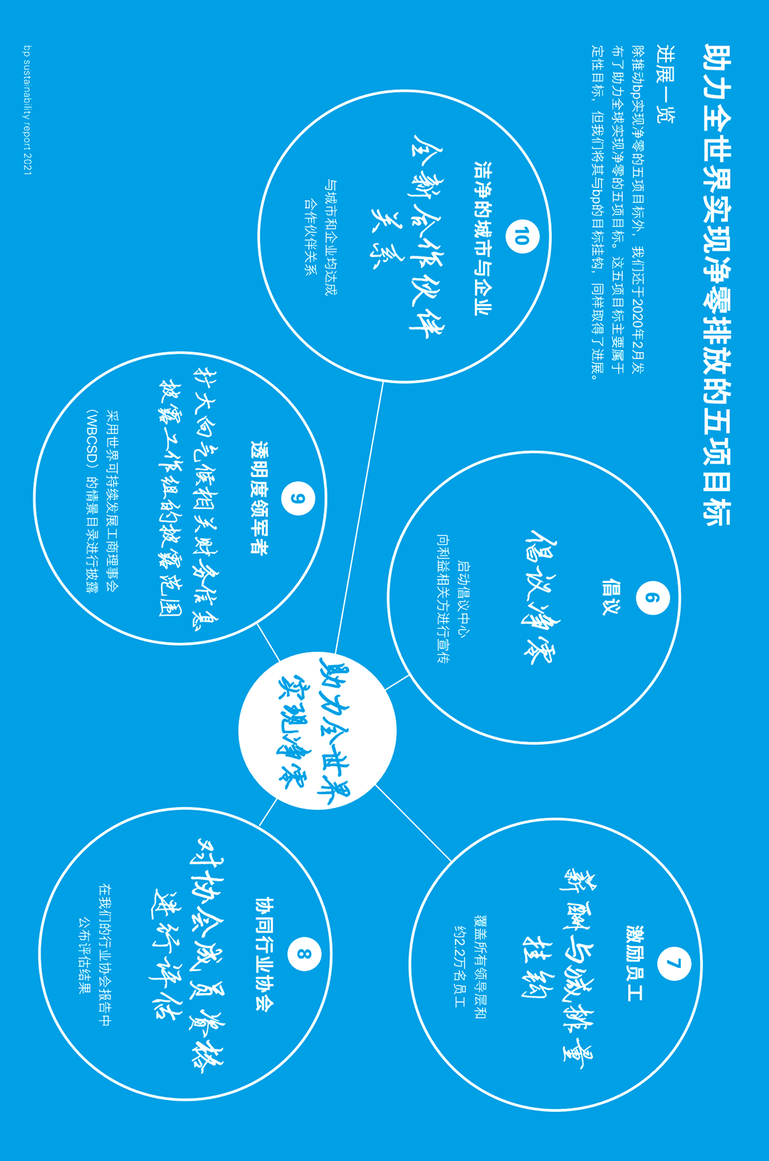 2020年2月,bp宣布了公司的全新使命,即“为人类和我们的地球重新构想整个能源行业”,随后围绕气候变化制定了十项具体目标,旨在让“bp到2050年或更早实现净零排放,并助力世界向这一目标迈进”,以及聚焦关爱地球和提升人类生活品质的各五项目标。这二十项具体目标构成一个有机整体,指导我们将可持续发展框架转化为实际行动。