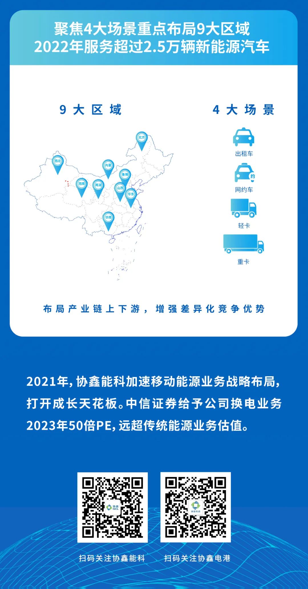 2021年,协鑫能科加速移动能源业务战略布局,打开成长天花板。中信证券给予公司换电业务2023年50倍PE,远超传统能源业务估值。
