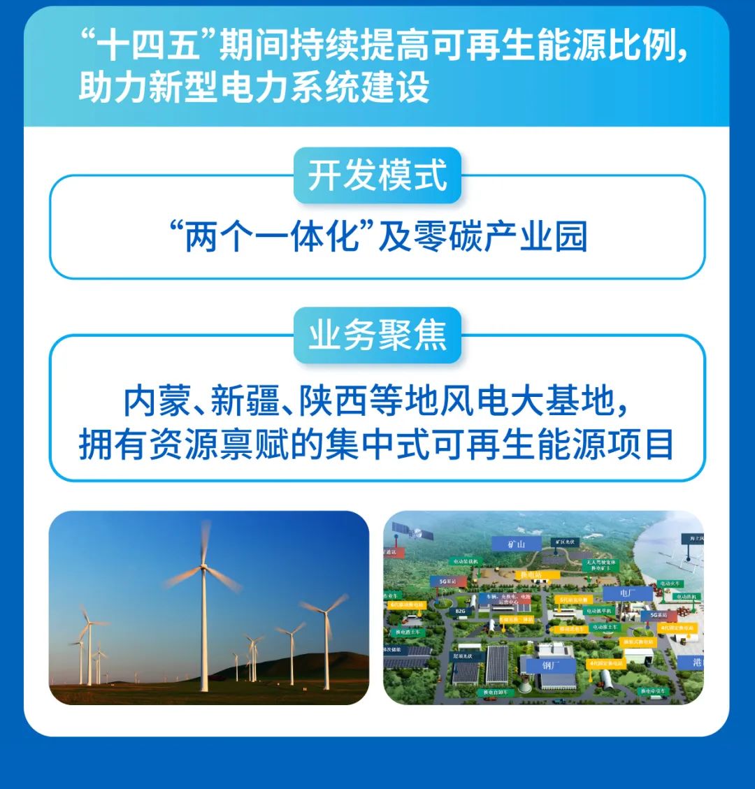 2022年,我们新能源开发目标为2GW,清洁能源投产规模将超280MW。“十四五”期间,协鑫能科将大力开发“两个一体化”及零碳产业园项目,聚焦内蒙、新疆、陕西等地风电大基地等可再生能源项目,助力新型电力系统建设。