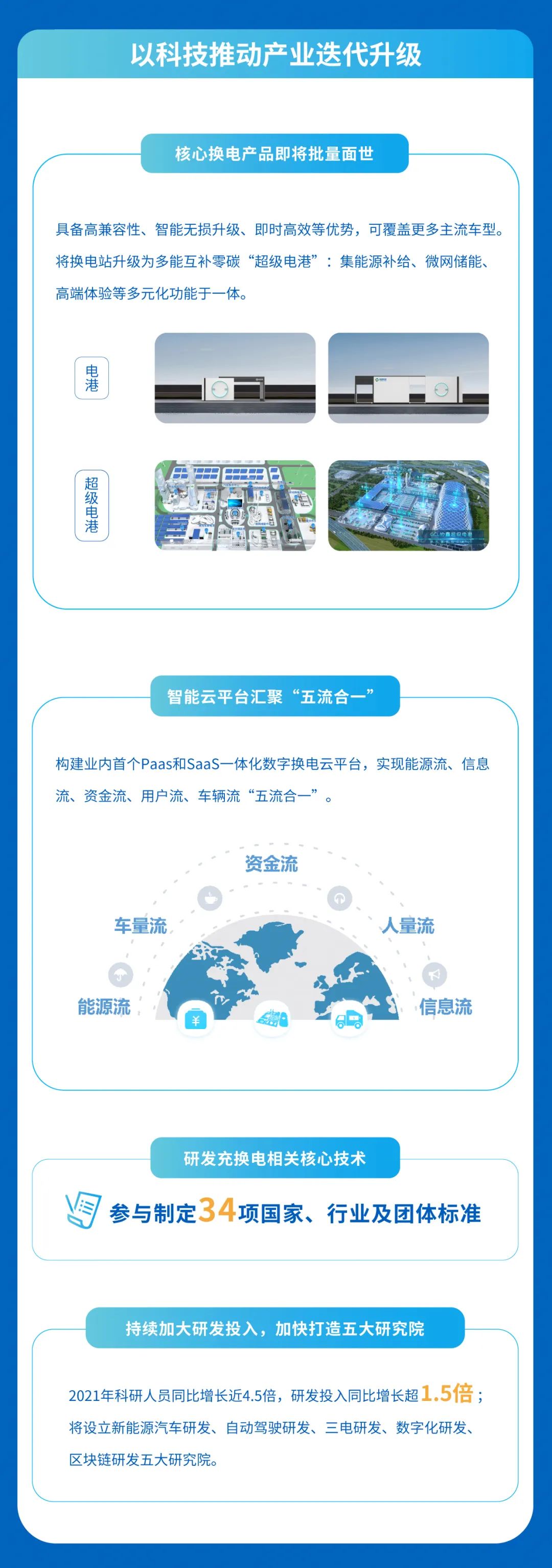 与此同时,协鑫能科发挥清洁能源、储能与补能生态的协同优势,迅速布局移动能源业务,全面整合汽车生产、电池制造、出行平台、物流企业等行业以及政府资源,构筑便捷、经济、绿色出行新生态;持续加大科研投入,打造核心换电产品,掌握多项自主研发的核心技术。今年3月公司接连公告完成定增募资37.65亿元,中金协鑫碳中和百亿产业投资基金首期不超过45亿元正式落地,自有资金实力增强,逐步奠定并巩固行业领先地位。
