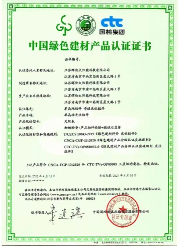 近日,苏美达能源辉伦太阳能单晶硅光伏组件顺利通过中国绿色建材产品最高等级三星认证,成功获得中国绿色建材产品认证证书。