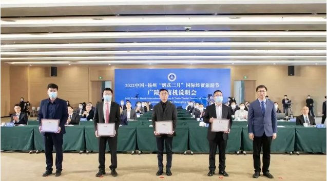 在4月17日举行的2022中国•扬州“烟花三月”国际经贸旅游节广陵区商机说明会上,宝利鑫新能源开发有限公司董事长梁田接受广陵区区长郎俊颁发的聘书,受聘为广陵区“招商大使”。