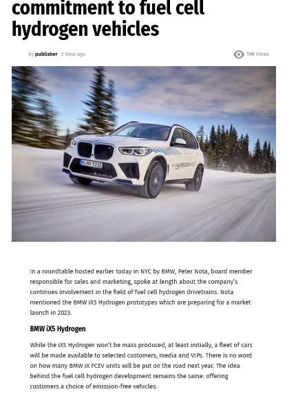 近日,在纽约的一次圆桌会议上,宝马负责销售和营销的董事会成员Nota详细谈到了该公司继续参与氢燃料电池汽车的计划。Nota提到了宝马iX5氢燃料电池汽车,该车正准备在2023年上市。