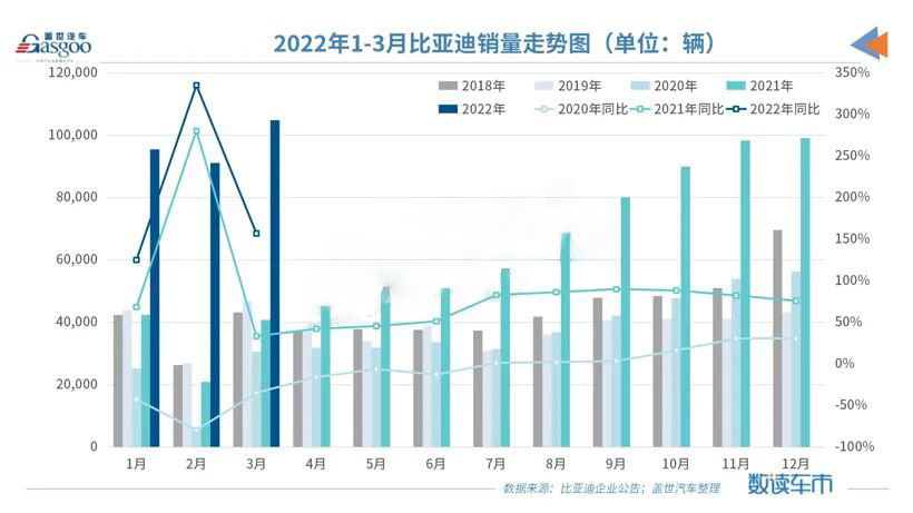 但根据比亚迪每月产销数据透露,其3月新车销量为104,878辆,同比增长156.95%。至此,2022年第一季度比亚迪累计销售新车291,378辆,同比增长179.78%