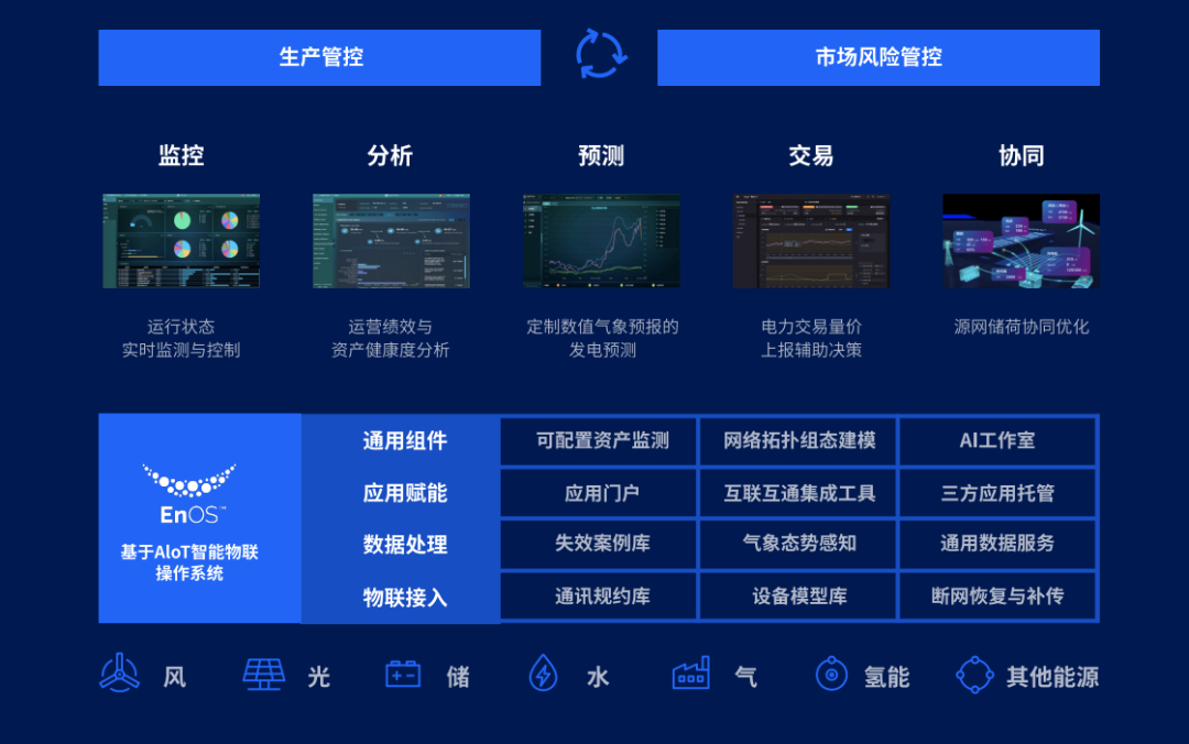 在能源电力领域, EnOS™套件为能源集团提供新一代生产营销一体化解决方案,包括全面资产监控、运营绩效透明、基于大数据和人工智能算法的设备健康分析、基于高精度数值气象预报的风光功率预则、面向电力市场的智能交易终端以及源网储荷、多能互补协同优化。