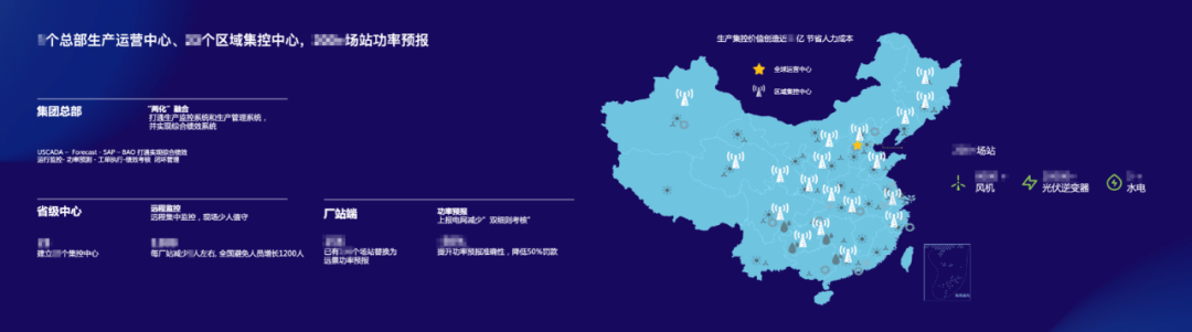 远景智能为某新能源发电集团28+GW风光资产建立集团大数据中心+省区域监控中心+基层场站的三级数字化运行和管控体系,包括:为其在全国数百家场站提供功率预测,所有省份建设集控中心,在北京为数万个光伏发电单元和万余台风机建立实时监测和绩效分析大数据平台,并与ERP系统实现“两化”融合,并实现了数据质量长效治理机制。