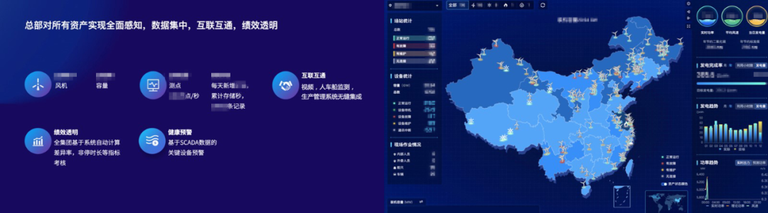 在项目实施阶段,在3个月短时间内成功接入19GW资产并标准化数据,创造了行业最快记录。同时在区域项目中实现管理到每台风机,监管严重报警、频繁故障,并首次实现了集团新能源多项绩效指标自动计算与对标管理。