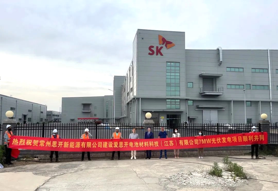 该项目是常州市金坛区爱思开电池材料科技(江苏)有限公司的屋顶项目,由SK建设(南京)有限公司下属子公司常州思开新能源有限公司(以下简称思开新能源)负责筹建,常州天合智慧能源工程有限公司负责EPC总承包,并网发电后,25年平均发电量约662.26万kWh,总发电量16556.48万kWh,减少二氧化碳排放128917吨,替代标准煤54898吨。