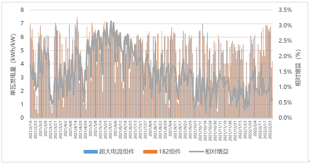 图2 182组件和超大电流组件单瓦发电量对比数据