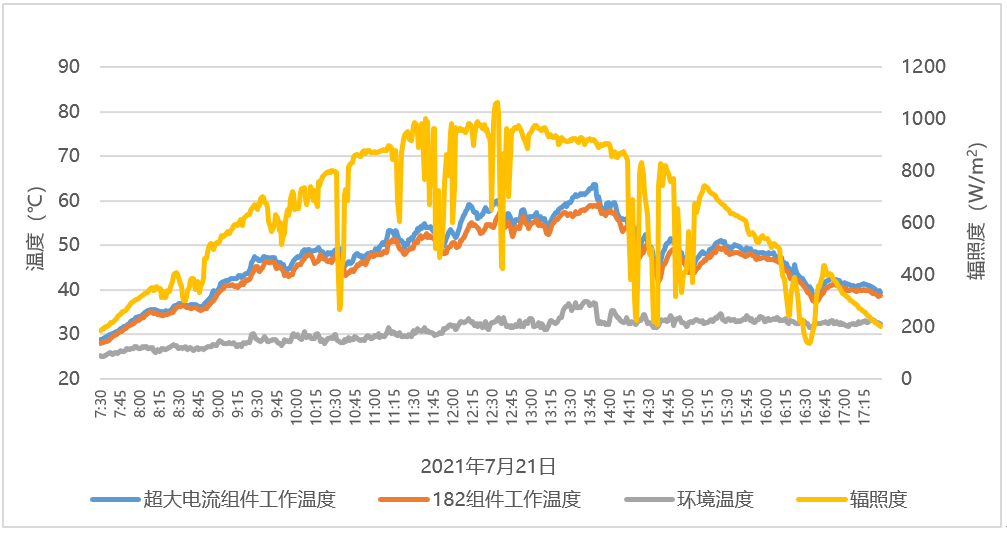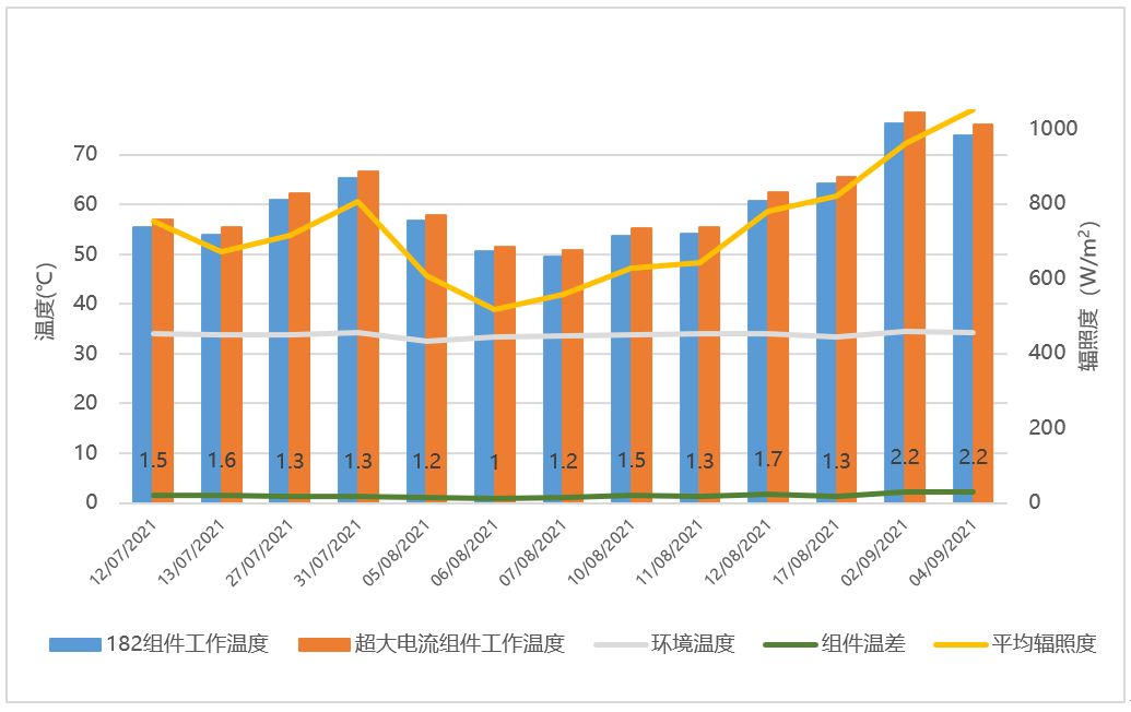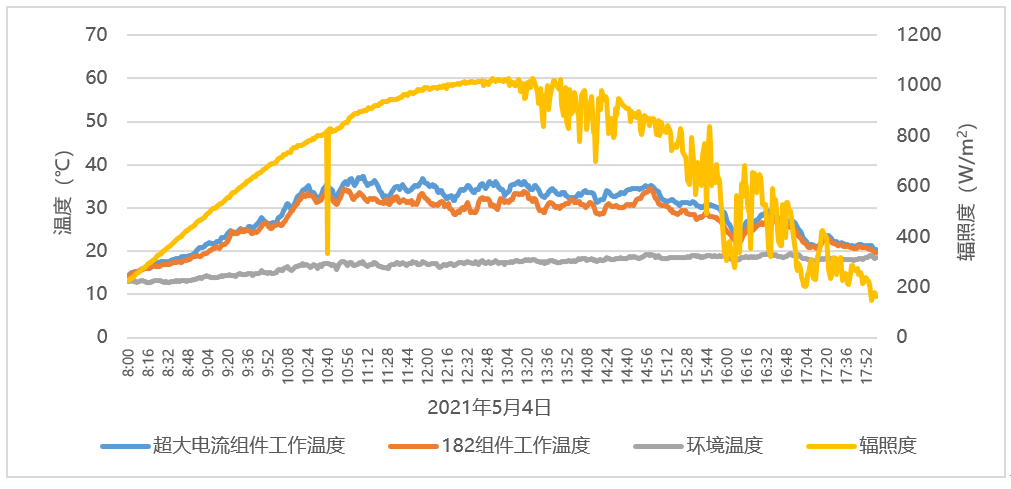 图4 海南实证项目182组件和超大电流组件工作温度对比数据