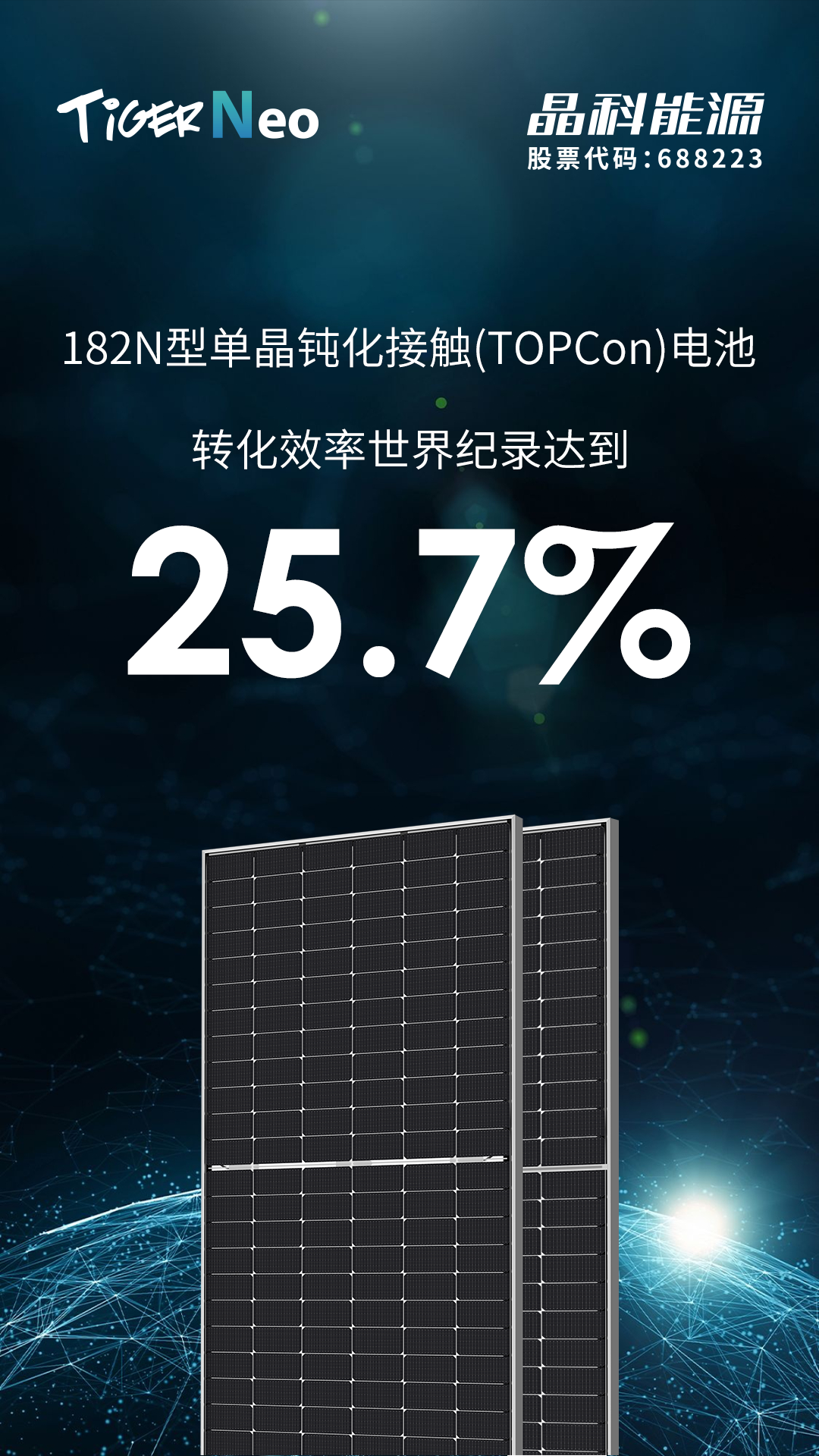 晶科能源今日宣布,晶科能源研究院所自主研发的182N型高效单晶硅电池技术取得重大突破,经权威第三方测试认证机构中国计量科学院检测实验室认证,全面积电池转化效率达到25.7%,再次创造了新的大面积N型单晶钝化接触(TOPCon)电池转化效率世界纪录。