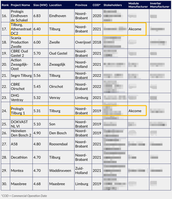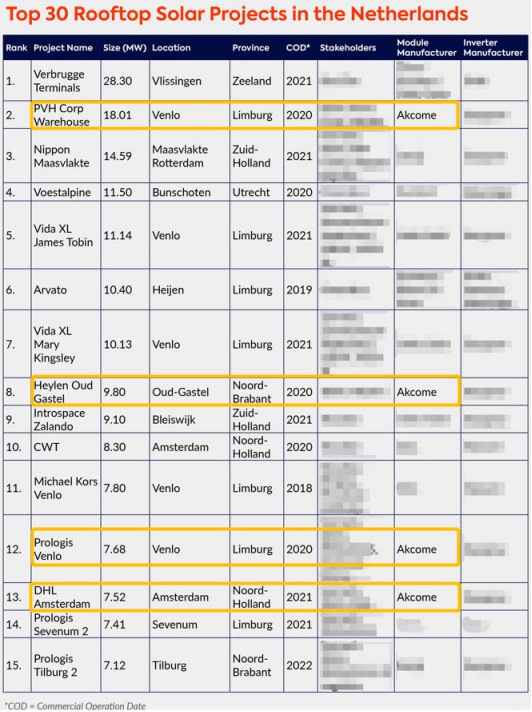 根据荷兰光伏媒体Solarplaza最新统计报道,在荷兰过去五年屋顶光伏项目装机排名中,排名前30的屋顶光伏项目里,使用爱康光电组件的屋顶项目有6个,组件出货占比排名位居前三。