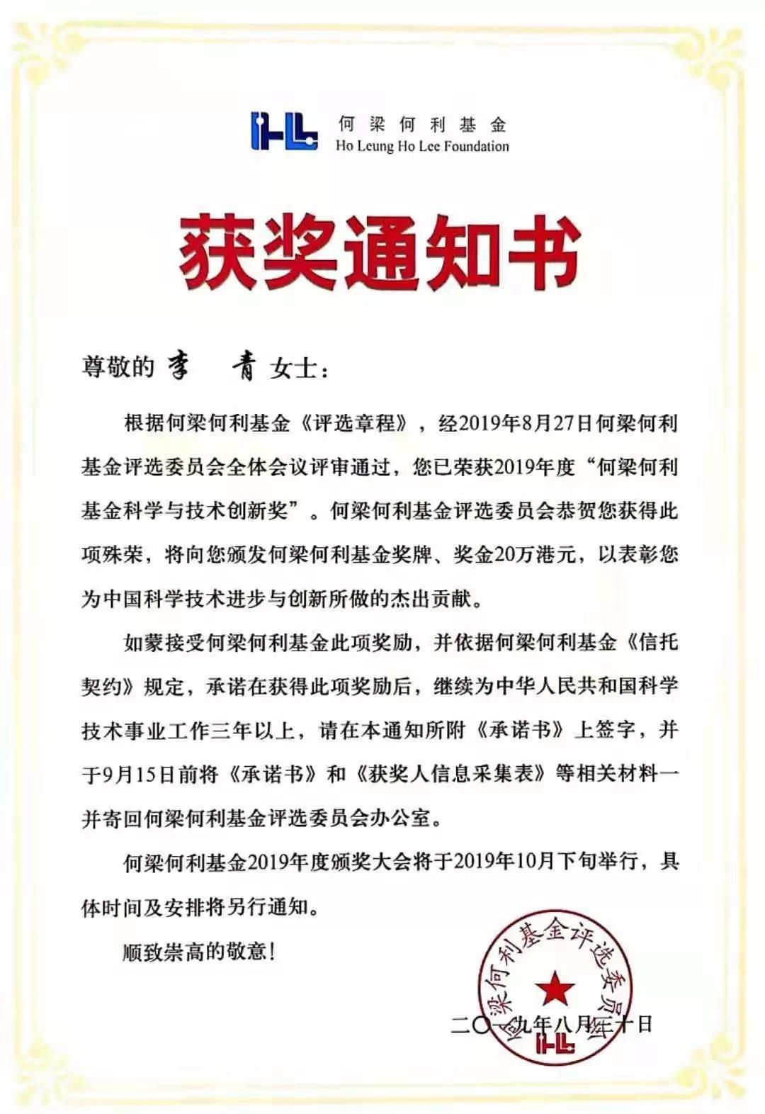 东旭集团总裁李青作为著名科技创新型女企业家、科学家,与军事科学院的何元智、清华大学的王书肖等19名科学家一同被授予“何梁何利基金科学与技术创新奖”。并由刘鹤副总理亲自颁奖。这是她在2019年初作为第一完成人在人民大会堂接受党和国家领导人颁发“国家科学技术进步奖”一、二等奖之后的又一荣光时刻。