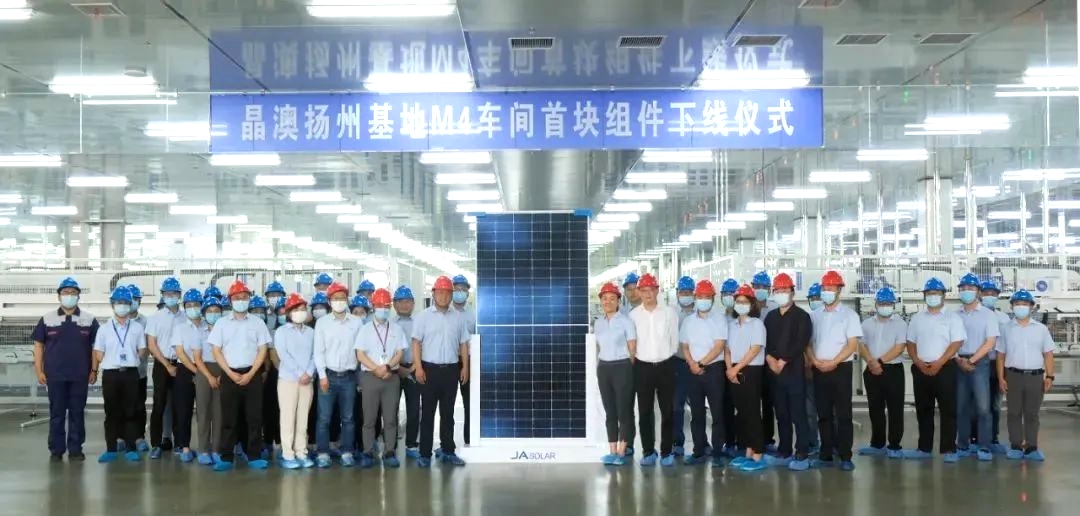 5月31日,晶澳科技扬州基地组件M4车间首块组件成功下线。经过各部门的通力协作,扬州基地克服疫情反复等不利因素的影响,保质保量完成项目工作。
