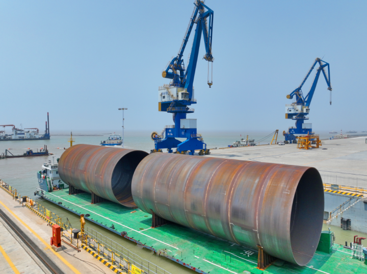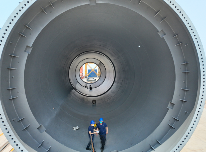 110米长、直径9.5米的海上风机单桩由一块块钢板卷成圆形焊接起来的,焊接一条缝,耗用焊条450公斤,内焊、外焊连续奋战3天3夜。一根海上风电单桩从卸料到发货,生产周期为45天。在48米高空驾驶800吨龙门吊起吊合拢桩基送入油漆处理工场的司机陈钰说:“端午3天不放假,助力‘双碳’作贡献。”