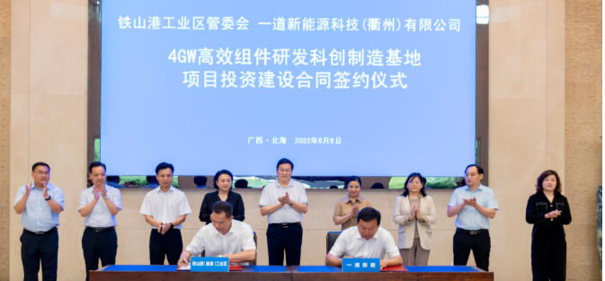 6月9日,广西北海市委书记蔡锦军会见一道新能源科技(衢州)有限公司董事长刘勇一行,双方进行了交流会谈,并见证了10GW高效组件研发科创制造基地项目投资合作框架协议签约仪式及4GW高效组件研发科创制造基地项目投资建设合同签约仪式。