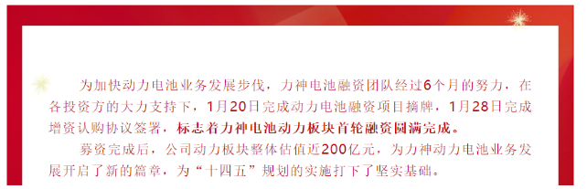 力神电池称,“募资完成后,公司动力板块整体估值近200亿元,为力神动力电池业务发展开启了新的篇章,为‘十四五’规划的实施打下了坚实基础。”