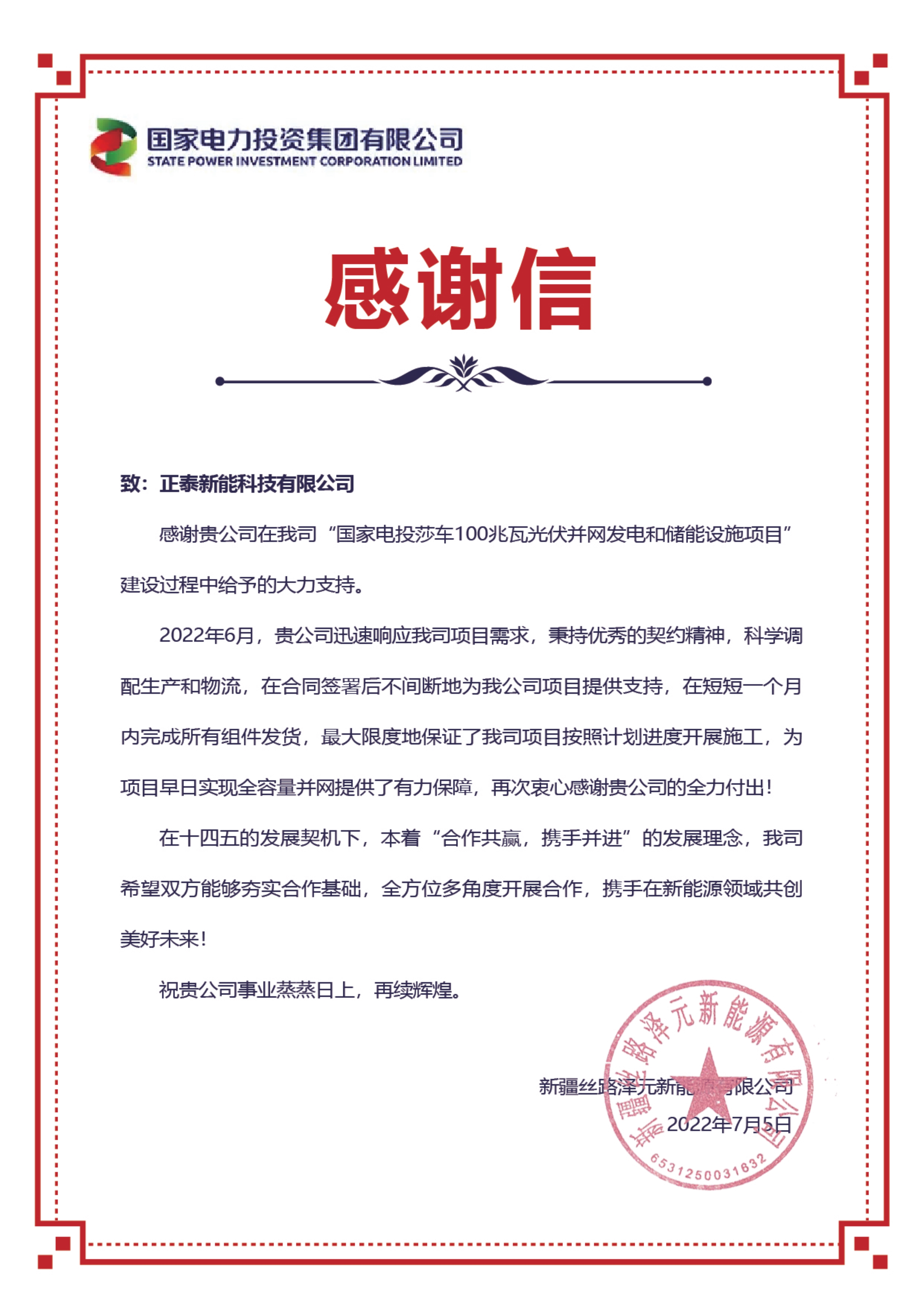 新疆丝路泽元新能源有限公司致正泰新能感谢信
