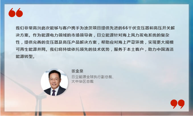 我们非常高兴此次能够与客户携手为涂茨项目提供先进的66千伏变压器和高压开关解决方案。作为能源电力领域的市场领导者,日立能源针对海上风力发电系统的复杂性,提供完善的变压器及高压产品解决方案,帮助应对海上严苛环境,实现更大规模可再生能源并网。我们将持续依托领先的技术优势,服务于本土客户,助力中国清洁能源转型。