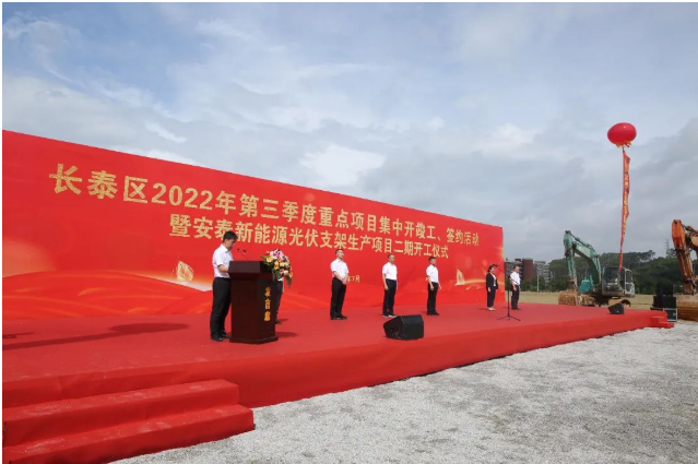 7月4日上午,漳州市长泰区举行2022年第三季度重点项目集中开竣工、签约活动暨安泰新能源光伏支架生产项目二期开工仪式。现场,漳州市委、长泰区委等有关领导一行人参加。安泰新能源董事长黄仕塔受邀出席,并就安泰新能源二期产业园情况做出汇报。