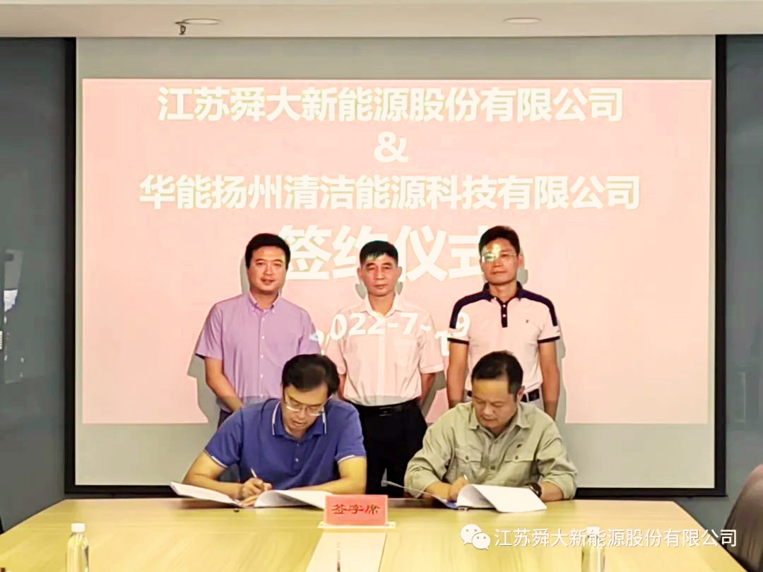 7月19日下午,华能扬州清洁能源科技有限公司总经理庞然一行来到江苏舜大新能源股份有限公司考察调研,并与我司签署合作框架协议,舜大股份公司董事长李进、副总经理韩国栋出席合作框架签约仪式,并与庞然总经理一行进行了座谈。