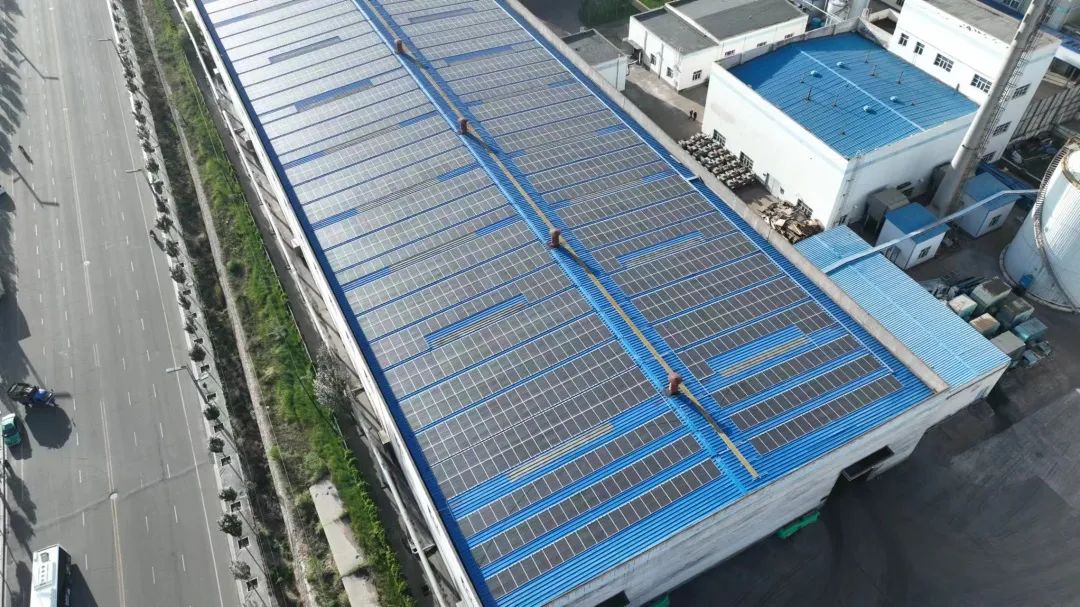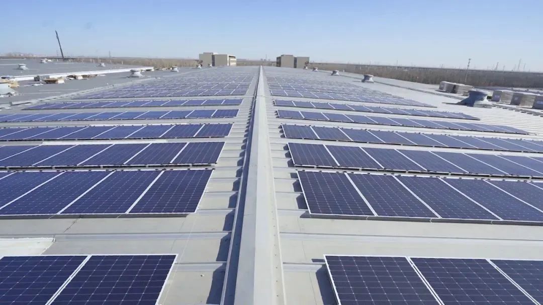 在河南鹤壁,某一工厂的彩钢瓦屋顶上铺排着日托轻柔组件,该项目展示出一个工商业分布式光伏的典型范例,为企业绿色发展贡献一份光伏力量。
