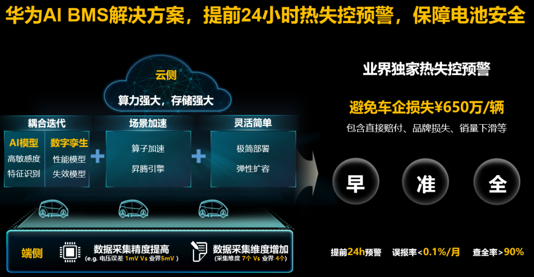 其次,华为AI BMS云端电池管理系统,通过AI模型和数字孪生耦合迭代升级,打造专属的自学习自优化人工智能算法,可提前24小时预警电池热失控风险,风险预警的查全率可高达90%,误报率可低至0.1%/月。