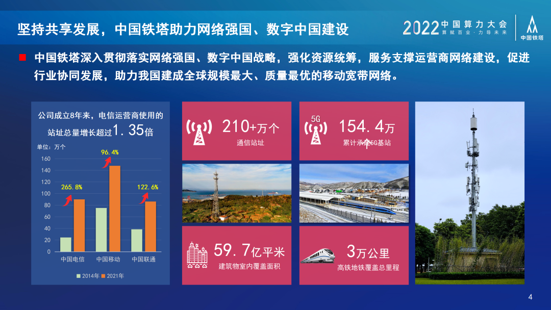 7月30日,在2022中国算力大会“算力筑基高质量发展”主论坛上,中国铁塔党委书记、董事长张志勇作了题为《深化共享发展,筑牢算力之基》的主旨演讲。