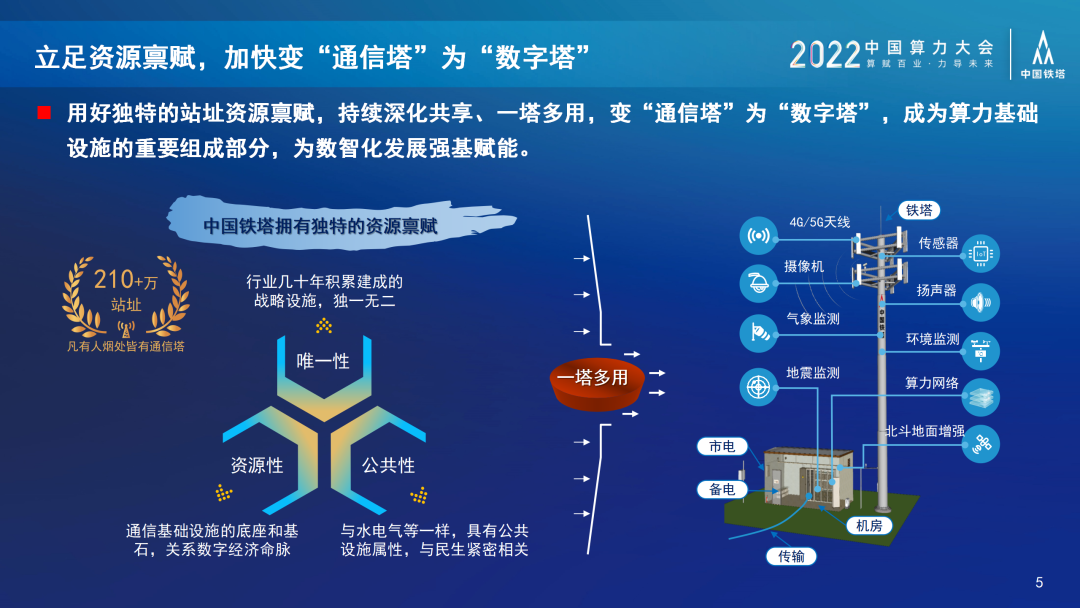 张志勇表示,目前,中国铁塔的站址规模达到了210万,机房超过90万,遍布全国各地,是全球最大的信息通信基础设施服务商。这些通信塔上有5G、下有光缆,中间有机房和不间断的电力供应,通信便捷、电力完备、配套齐全,形成了独一无二的资源禀赋。并通过持续深化共享、一塔多用,变“通信塔”为“数字塔”,成为算力基础设施的重要组成部分,为数智化发展强基赋能。
