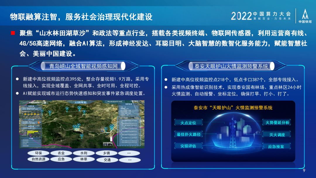 在青岛崂山,铁塔公司新建中高位视频监控点395处,整合存量视频监控1.9万路,与运营商一道,建成了全域智能视频感知网,助力城市运行状态快速感知和突发事件紧急调度处置。在泰安,铁塔公司依托站址资源建成了“天眼护山”火情监测预警系统,实现泰安国有林场、重点林区24小时火情监测、自动报警、坐标定位,确保“打早、打小、打了”。