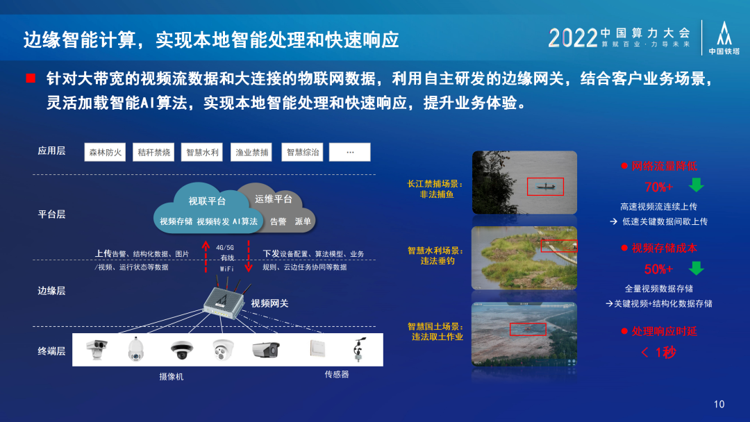 此外,针对大带宽的视频流数据和大连接的物联网数据,铁塔公司利用自主研发的边缘网关,在长江禁捕、智慧水利、智慧国土等业务场景,结合客户需求,灵活加载相应的AI算法,实现本地智能计算和快速响应。从应用效果来看,网络流量降幅超过70%,视频存储成本可降低50%以上,处理响应时延低于1秒,大幅提升了业务体验。