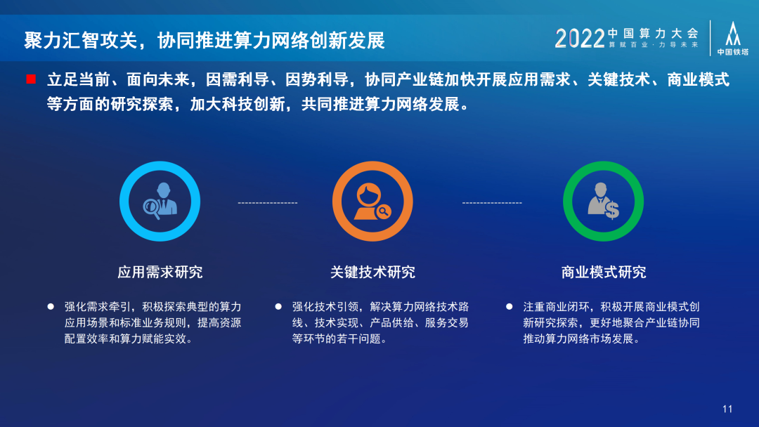 张志勇强调,算赋百业,力导未来。中国铁塔将以习近平新时代中国特色社会主义思想为指引,全面完整准确贯彻新发展理念,积极融入数字经济发展大局,协同产业链加快开展算力应用需求、关键技术、商业模式等方面的研究探索,加强科技创新、加大研发投入,共同推进算力网络发展,为算力基础设施建设做出铁塔贡献。