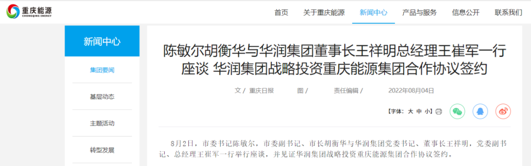 8月2日,重庆市委书记陈敏尔,市委副书记、市长胡衡华与华润集团党委书记、董事长王祥明,党委副书记、总经理王崔军一行举行座谈,并见证华润集团战略投资重庆能源集团合作协议签约。