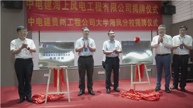 随后,海南省国资委副主任陈洁,中国电建集团党委常委、副总经理刘源,贵州工程公司党委书记、董事长郭玮,贵州工程公司党委副书记、董事、总经理王远辉,中国电建集团中南勘测设计研究院有限公司副总经理陈鹏,奥克斯集团董事长郑坚江,阳明智慧能源集团股份公司执行总裁刘连玉共同为中电建海上风电工程有限公司揭牌。