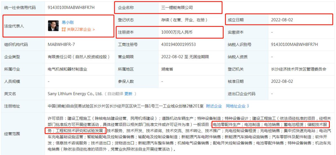 企查查信息显示,8月2日,三一锂能有限公司(简称“三一锂能”)正式成立。该公司的法定代表人为易小刚,注册资本为1亿元人民币。