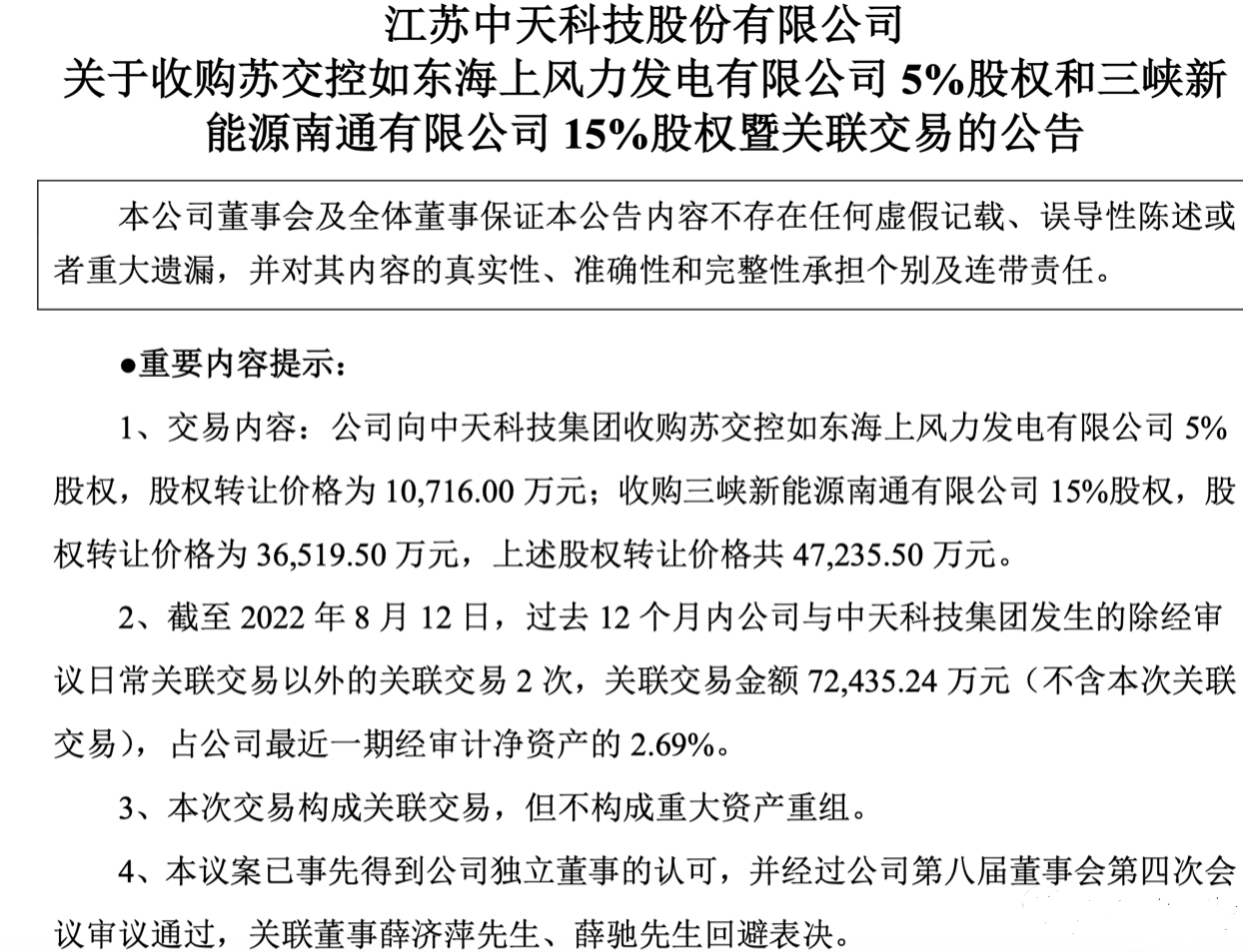 根据公告,中天科技股份为整合业务资源,拓展海上风力发电相关产业,与中天科技集团有限公司(以下简称“中天科技集团”)于2022年8月12日签订了《股权转让协议》,中天科技股份向中天科技集团收购苏交控如东海上风力发电有限公司(以下简称“苏交控如东风电”)5%股权和三峡新能源南通有限公司(以下简称“三峡南通公司”)15%股权,上述股权转让价格共47,235.50万元。