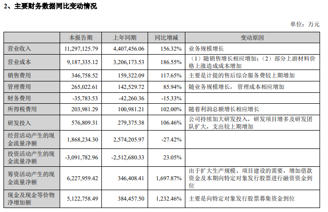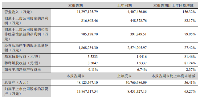 23日晚间,宁德时代(SZ:300750)公布了上半年业绩。公告显示,公司2022年半年度实现营业收入为1129.71亿元,同比增长156.32%;归母净利润81.68亿元,同比增长82.17%。