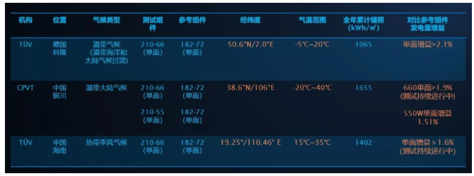 经过国际权威第三方检测机构TÜV莱茵和CPVT中国国家光伏质检中心在全球不同纬度、不同气温和不同的辐照条件下进行的实证测试,在高、中、低纬度不同环境下,600W+组件实测发电量均高于参考组件,单瓦发电增益在1.51%~2.1%。600W+组件的发电优势在全球大部分地区得以充分发挥。