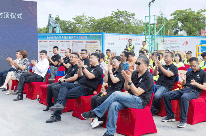 在大家的分享和欢笑后,仪式也进入最后收尾阶段。伴随礼炮齐发、彩烟升腾,大家共同为沃太能源总部大楼浇筑最后一方混凝土,一铲又一铲装满期望,一铲又一铲开启辉煌,满载着成功的喜悦和美好的祝福,沃太能源十周年庆暨总部项目封顶仪式圆满落幕。