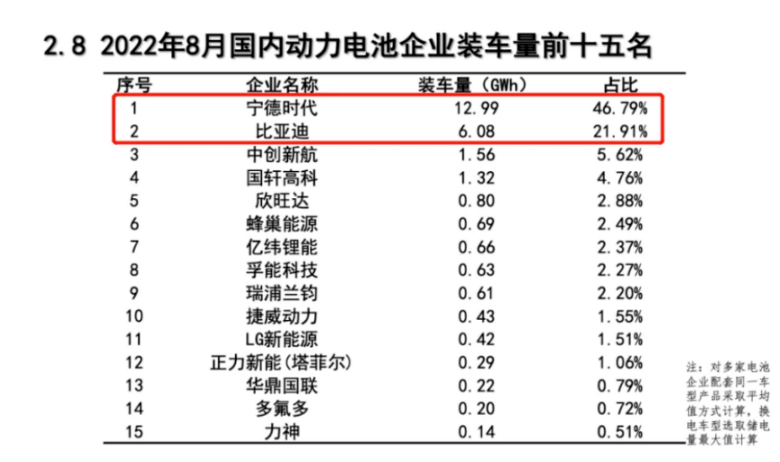8月,我国动力电池装车量27.75GWh,同比增长121.3%,环比增长14.7%,1—8月,我国动力电池累计装车量162.1GWh,累计同比增长112.3%。其中,宁德时代仍牢牢占据榜首位置,装车量为12.99GWh,市场份额为46.79%,比亚迪则排名第二,市场份额为21.91%。
